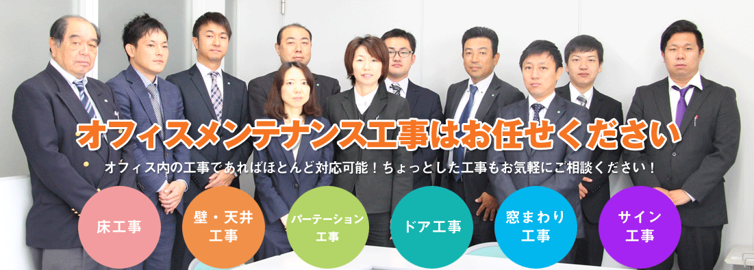 久留米オフィスづくり.comが福岡県久留米市周辺で実施したオフィス環境づくりの施工事例をご覧いただけます。私達は年間200件以上の豊富な施工実績があるため、安心してオフィス環境づくりをお任せください。