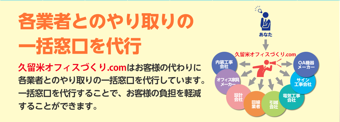 オフィスづくりに一括対応 - オフィス環境づくりで発生する工事は、オフィスデザイン会社やオフィス家具メーカー、オフィス内装工事会社、パーテーションメーカーなど複数の業者が絡む複合的な工事が必要になるケースが多いです。そのため、オフィス環境づくりの規模が大きくなると、各業者との連絡や日程調整が複雑になり、些細な調整ミスがその後の工程に支障をきたす危険性があります。久留米オフィスづくり.comはオフィス環境づくりに関わる全ての業務に一括で対応することができます。オフィス環境づくりは久留米オフィスづくり.comにお任せください。