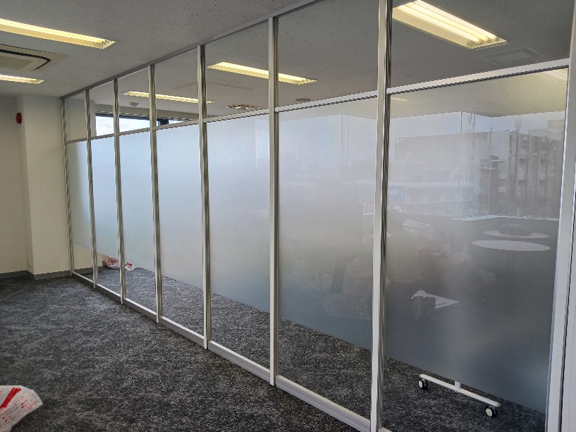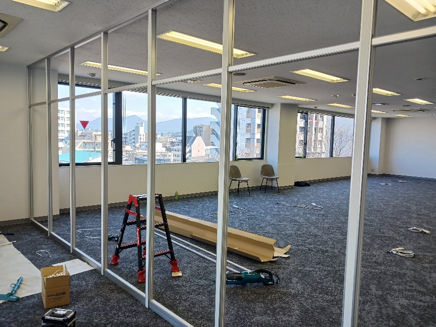 作業初日は間仕切り工事を行い、2日目にはオフィス移転作業およびフォグラスシートの施工(すりガラス調の目隠し用フィルム貼り)を実施いたしました。