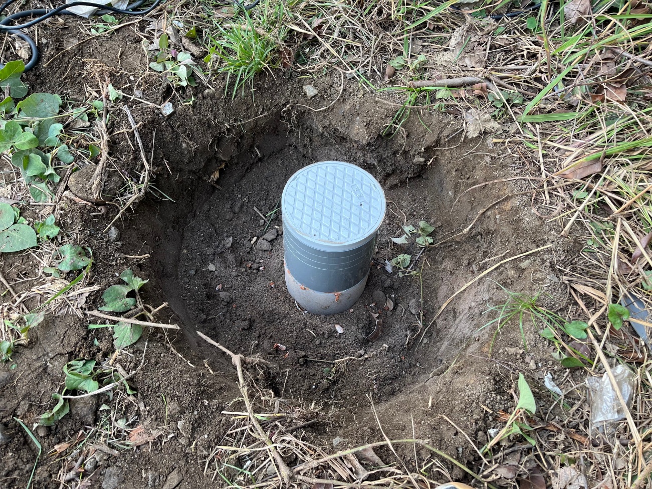 削岩機で回りの土をほぐして、30センチほど掘り進めて配管の割れているところで切断して配管アダプタと蓋を取り付け、最後に埋め戻し作業を行い工事は完了しました。